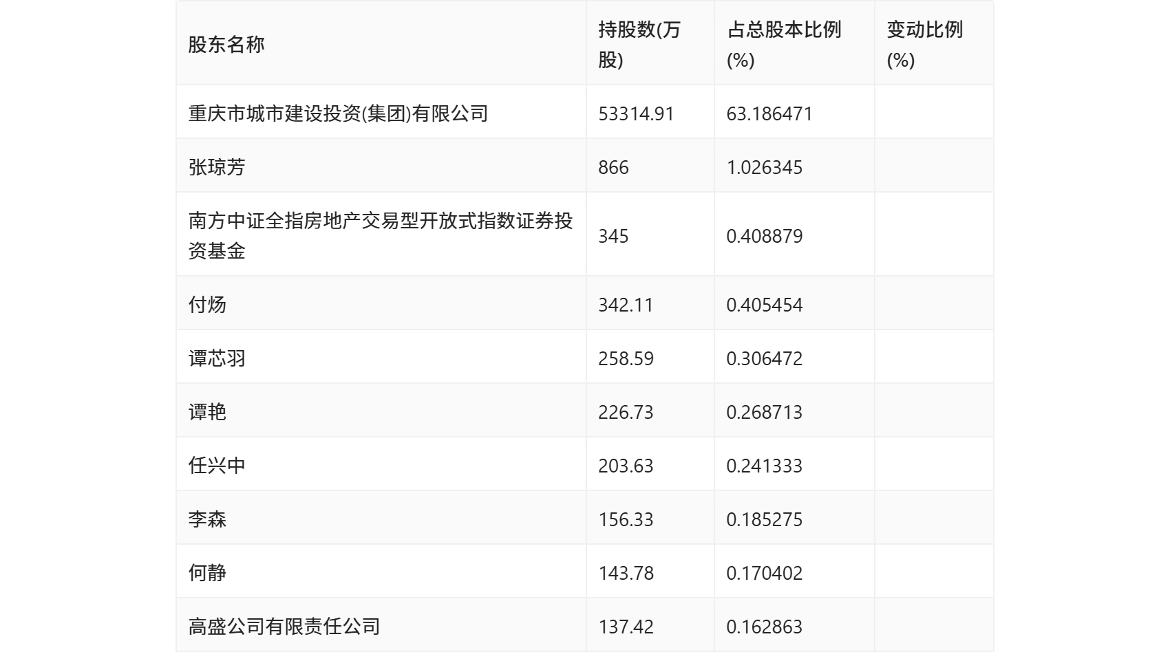 值得注意的是,根据半年报数据,渝开发31.33%股份处于质押状态。其中,第一大股东重庆市城市建设投资(集团)有限公司质押2.64亿股公司股份,占其全部持股的49.58%。