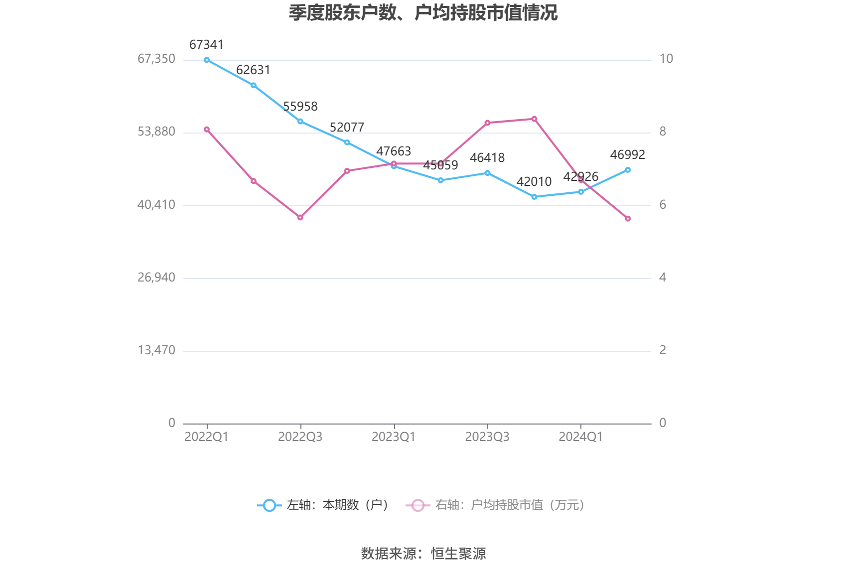 筹码集中度方面,截至2024年上半年末,公司股东总户数为4.7万户,较一季度末增长了4066户,增幅9.47%;户均持股市值由一季度末的6.70万元下降至5.64万元,降幅为15.82%。