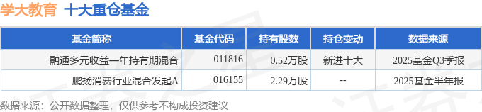持有学大教育最多的基金为融通多元收益一年持有期混合,目前规模为0.15亿元,最新净值1.0111(10月27日),较上一交易日上涨0.58%,近一年上涨2.36%。该基金现任基金经理为樊鑫 石础 李皓。