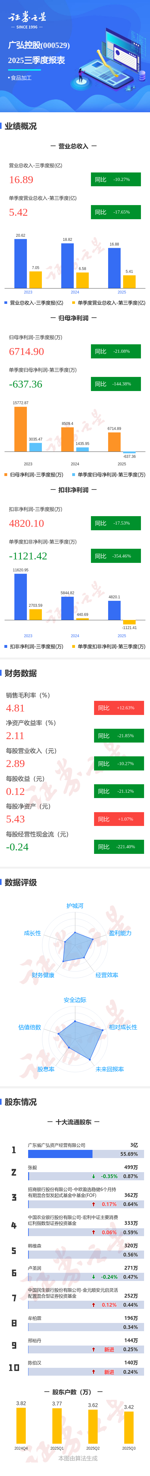 图解广弘控股三季报:第三季度单季净利润同比下降144.39%
