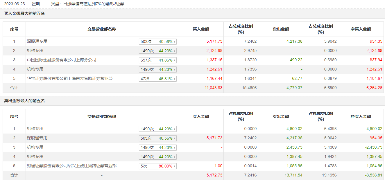 具体来看,机构买入3367.29万元,卖出8438.21万元,合计净卖出5070.91万元。此外,深股通专用、中国国际金融上海分公司分别买入5171.73万元、1337.16万元;深股通专用、财通证券绍兴上虞江扬路证券营业部分别卖出4217.38万元、1055.96万元。