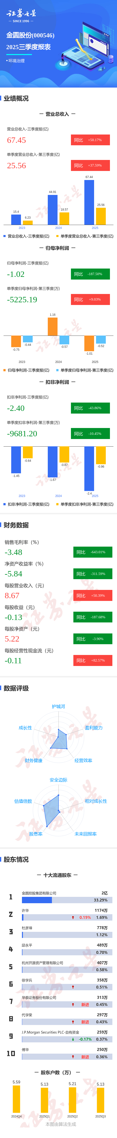 证券之星消息,金圆股份2025年三季报显示,公司主营收入67.45亿元,同比上升50.17%;归母净利润-1.02亿元,同比下降187.51%;扣非净利润-2.4亿元,同比下降43.86%;其中2025年第三季度,公司单季度主营收入25.56亿元,同比上升37.59%;单季度归母净利润-5225.19万元,同比上升9.03%;单季度扣非净利润-9681.2万元,同比下降10.46%;负债率19.57%,投资收益1408.14万元,财务费用-599.67万元,毛利率-3.48%。