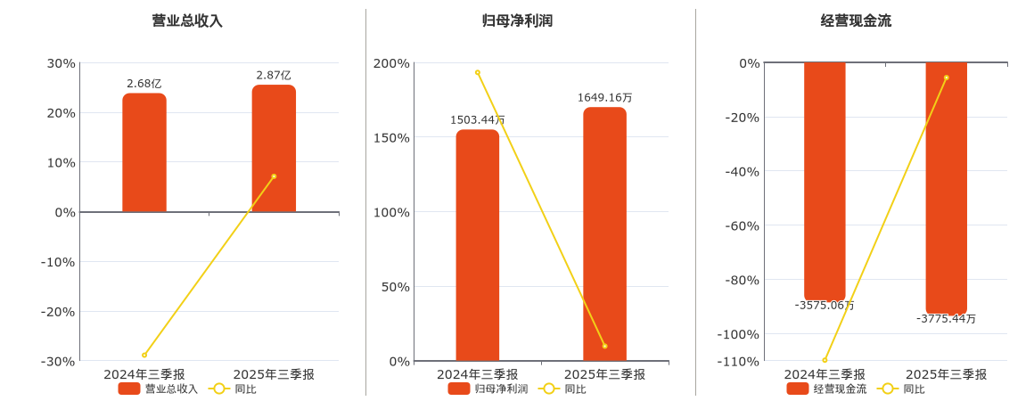 公司营业总收入为2.87亿元,较去年同报告期营业总收入增加1895.72万元,同比较去年同期上涨7.07%。归母净利润为1649.16万元,较去年同报告期归母净利润增加145.72万元,实现2年连续上涨,同比较去年同期上涨9.69%。经营活动现金净流入为-3775.44万元。