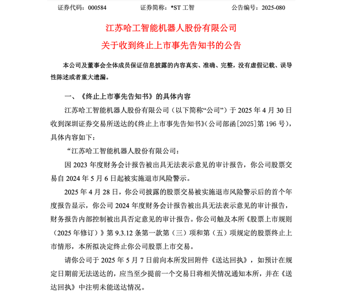 根据公告,*ST工智于2025年4月30日收到深圳证券交易所送达的《终止上市事先告知书》(公司部函[2025]第196号)。