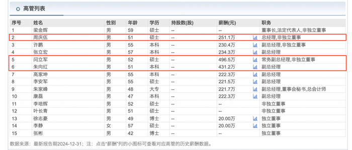 据瑞财社查阅,2024年,古井贡酒常务副总经理闫立军496.5万元,副总经理朱向红薪酬431.2万元,均高于总经理周庆伍薪酬251.1万元。