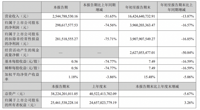 2025年前三季度,古井贡酒实现营业收入164.25亿元,同比下降13.87%;归母净利润39.6亿元,同比下降16.57%。其中第三季度营业收入25.45亿元,同比下降51.65%;归母净利润2.99亿元,同比下降74.56%。