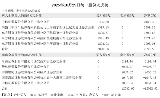 卖出前5席为:开源证券股份有限公司西安西大街证券营业部、华林证券股份有限公司北京分公司、中国银河证券股份有限公司绍兴证券营业部、国泰海通证券股份有限公司长沙五一大道第二证券营业部、中信证券股份有限公司上海分公司。共计买入:0万元,共计卖出:12032.92万元。