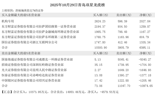 买入前5席为:机构专用、东方财富证券股份有限公司拉萨团结路第一证券营业部、东方财富证券股份有限公司拉萨金融城南环路证券营业部、东方财富证券股份有限公司拉萨东环路第二证券营业部、国信证券股份有限公司浙江互联网分公司。共计买入:10300.90万元,共计卖出:3905.79万元。
