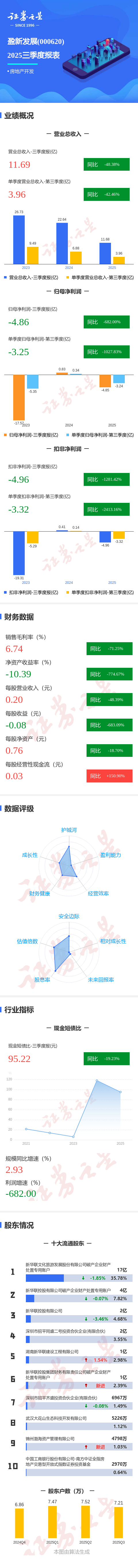 证券之星消息,盈新发展2025年三季报显示,前三季度公司主营收入11.69亿元,同比下降48.38%;归母净利润-4.86亿元,同比下降682.0%;扣非净利润-4.96亿元,同比下降1281.42%;其中2025年第三季度,公司单季度主营收入3.96亿元,同比下降42.46%;单季度归母净利润-3.25亿元,同比下降1027.84%;单季度扣非净利润-3.32亿元,同比下降2413.16%;负债率58.49%,投资收益-89.28万元,财务费用6627.07万元,毛利率6.74%。