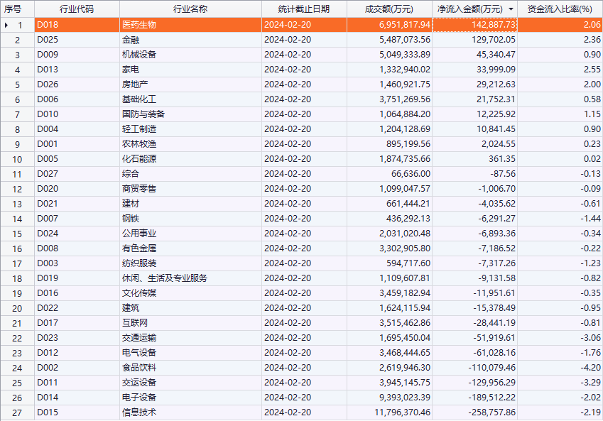 上证报中国证券网讯 据Choice数据统计,今日A股主力资金净流出46.98亿元;行业方面,医药生物净流入居首,为14.29亿元,金融净流入12.97亿元,机械设备净流入4.53亿元;净流出金额最多的是信息技术,高达25.88亿元,电子设备净流出18.95亿元,交运设备净流出13亿元。个股方面,主力资金净流入前三的是格力电器、人民网、药明康德,分别净流入2.87亿元、2.73亿元、2.51亿元;净流出前三的是贵州茅台、万兴科技、赛力斯,分别净流出6.12亿元、5.79亿元、4.99亿元。