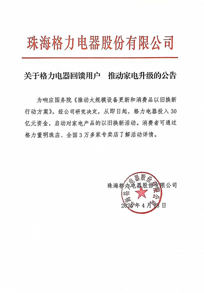 4月28日发布公告称,为响应国务院《推动大规模设备更新和消费品以旧换新行动方案》,经公司研究决定,从即日起,格力电器投入30亿元资金,启动对家电产品的以旧换新活动。