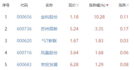 其中,金科股份、苏州高新、*ST新联、凤凰股份、京投发展位列板块涨幅前五位,涨幅分别为10.28%、3.35%、1.83%、1.68%、1.29%。