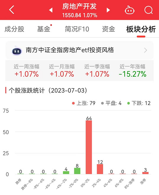 中国经济网北京7月3日讯 今日,房地产开发板块整体涨幅1.07%,其中,79只股票上涨,4只股票平盘,12只股票下跌。