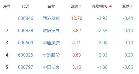 同济科技、财信发展、中迪投资、华发股份、中国武夷位列涨幅榜后五位,涨幅分别为-3.93%、-2.55%、-2.08%、-2.03%、-1.86%。