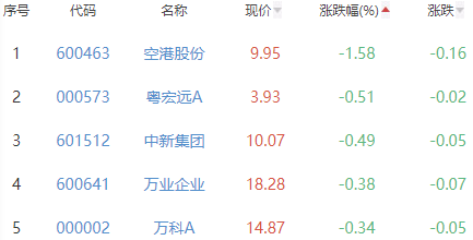 空港股份、粤宏远A、中新集团、万业企业和万科A位列涨幅榜后五位,涨幅分别为-1.58%、-0.51%、-0.49%、-0.38%和-0.34%。