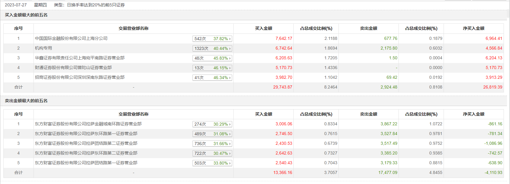 东方财富证券拉萨金融城南环路证券营业部、东方财富证券拉萨东环路第一证券营业部分别卖出3867.22万元、3527.84万元。