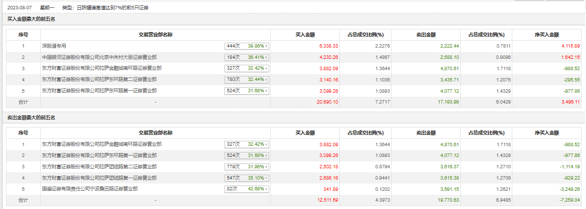 具体来看,知名游资现身龙虎榜,宁波桑田路(国盛证券有限责任公司宁波桑田路证券营业部)净卖出3249.26万元。此外,东方财富证券拉萨金融城南环路证券营业部、东方财富证券拉萨东环路第一证券营业部分别卖出4870.61万元、4077.12万元;深股通专用、中国银河证券北京中关村大街证券营业部分别买入6338.33万元、4230.26万元。