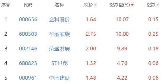 其中,金科股份、华丽家族、荣盛发展、ST世茂、中南建设位列板块涨幅榜前五位,涨幅分别为10.07%、10.00%、9.89%、4.76%、4.22%。