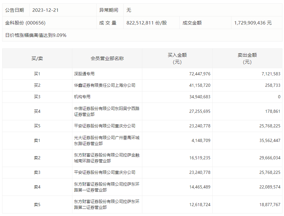 12月21日,金科股份今日涨停,全天换手率达15.49%,振幅达11.28%。龙虎榜数据显示,营业部席位合计净买入1.07亿元。其中,机构合计净买入3494.07万元。此外,深股通专用、华鑫证券上海分公司分别买入7244.80万元、4115.87万元;光大证券广州番禺环城东路证券营业部、东方财富证券拉萨金融城南环路证券营业部分别卖出3556.24万元、2966.60万元。