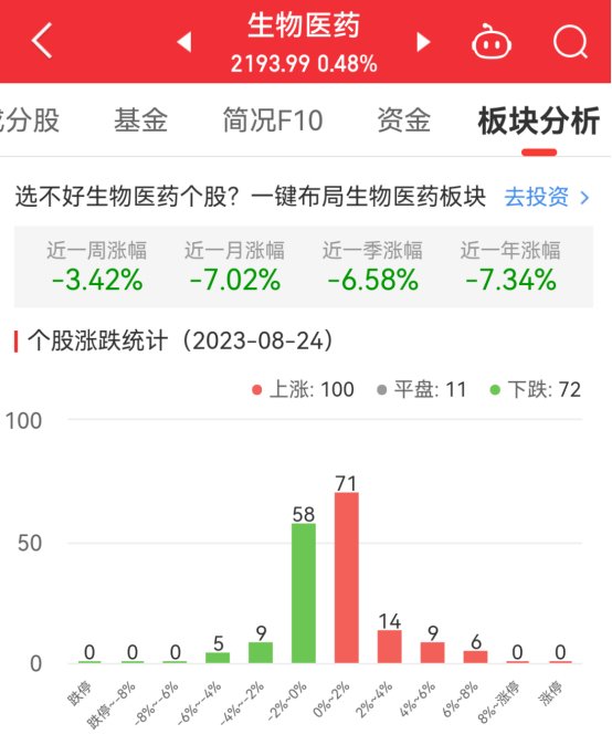 中国经济网北京8月24日讯今日,生物医药板块整体涨幅0.48%,其中100只股票上涨,11只股票平盘,72只股票下跌。