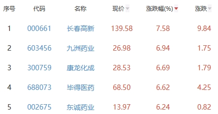 其中,长春高新、九洲药业、康龙化成、毕得医药、东诚药业位列板块涨幅前五位,涨幅分别为7.58%、6.94%、6.69%、6.62%、6.24%。