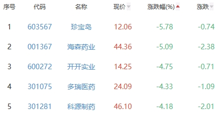 珍宝岛、海森药业、开开实业、多瑞医药、科源制药位列涨幅榜后五位,涨幅分别为-5.78%、-5.09%、-4.75%、-4.33%、-4.18%。