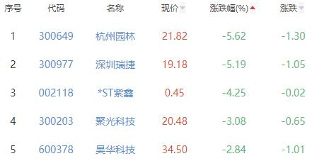 杭州园林、深圳瑞捷、*ST紫鑫、聚光科技、昊华科技位列涨幅榜后五位,涨幅分别为-5.62%、-5.19%、-4.25%、-3.08%、-2.84%。