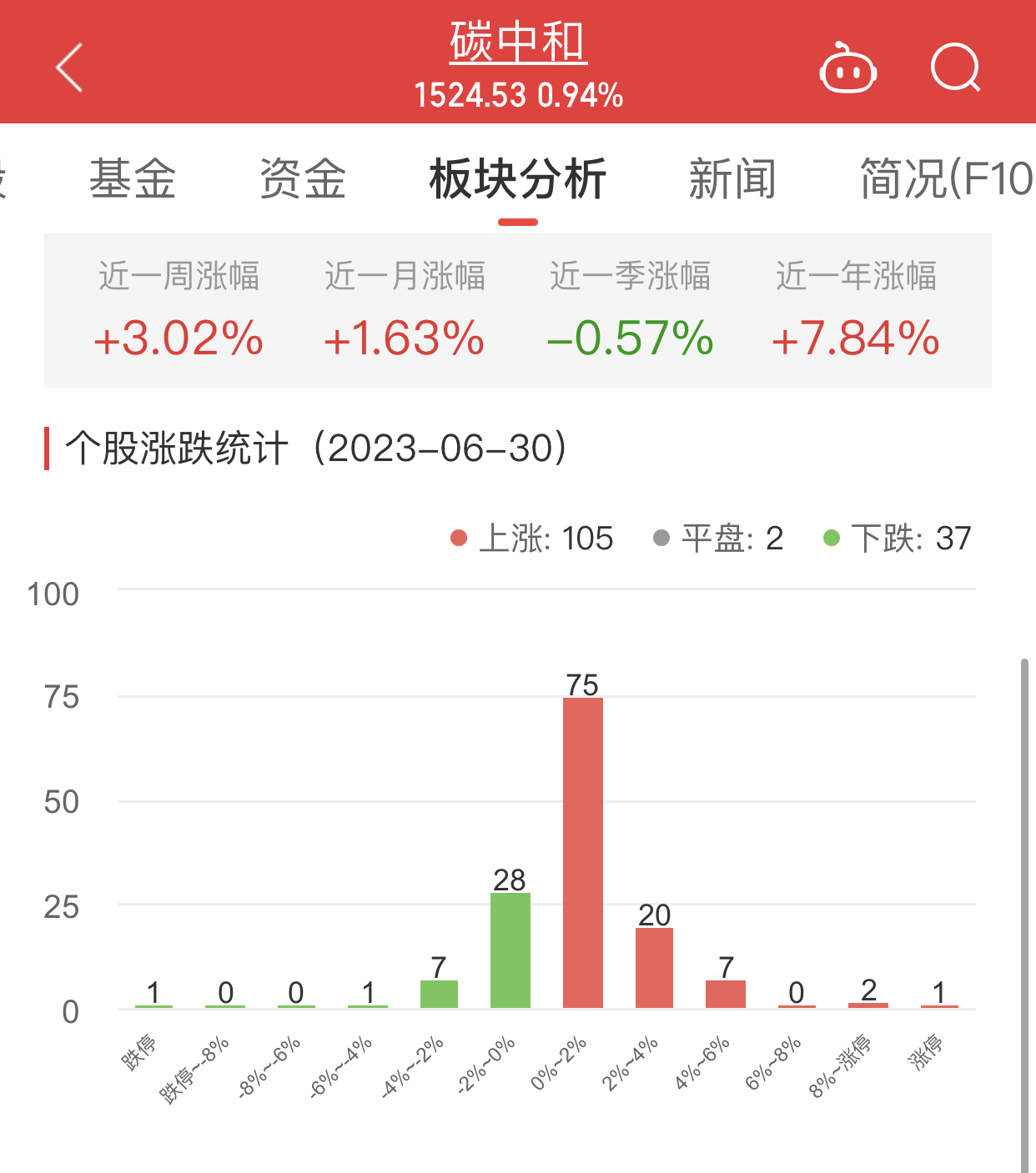 中国经济网北京6月30日讯 今日,碳中和板块整体涨幅0.94%,其中105只股票上涨,2只股票平盘,37只股票下跌。