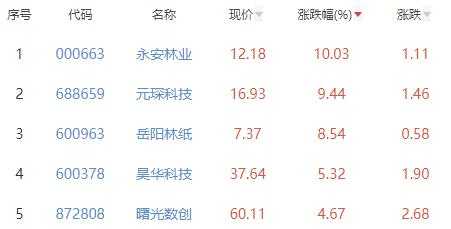 其中,永安林业、元琛科技、岳阳林纸、昊华科技、曙光数创位列板块涨幅前五位,涨幅分别为10.03%、9.44%、8.54%、5.32%、4.67%。