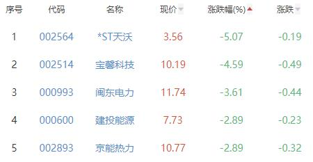 *ST天沃、宝馨科技、闽东电力、建投能源、京能热力位列涨幅榜后五位,涨幅分别为-5.07%、-4.59%、-3.61%、-2.89%、-2.89%。
