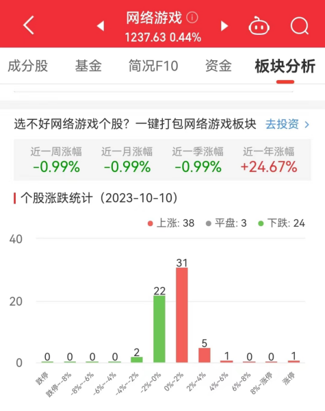 中国经济网北京10月10日讯今日,网络游戏板块整体涨幅0.44%,其中38只股票上涨,3只股票平盘,24只股票下跌。