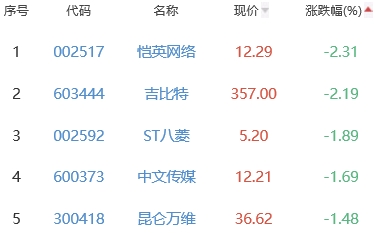 恺英网络、吉比特、ST八菱、中文传媒、昆仑万维位列涨幅榜后五位,涨幅分别为-2.31%、-2.19%、-1.89%、-1.69%、-1.48%。
