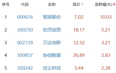 其中,智度股份、初灵信息、万达电影、协创数据、佳云科技位列板块涨幅前五位,涨幅分别为10.03%、5.21%、3.21%、2.83%、2.38%。