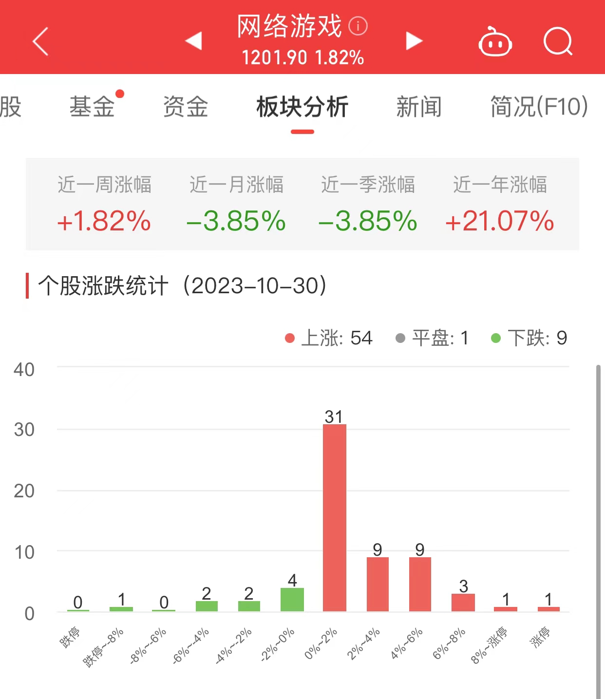 中国经济网北京10月30日讯今日,网络游戏板块整体涨幅1.82%,其中54只股票上涨,1只股票平盘,9只股票下跌。