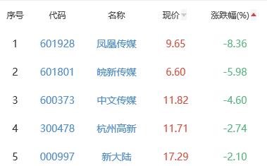 凤凰传媒、皖新传媒、中文传媒、杭州高新、新大陆位列涨幅榜后五位,涨幅分别为-8.36%、-5.98%、-4.60%、-2.74%、-2.10%。