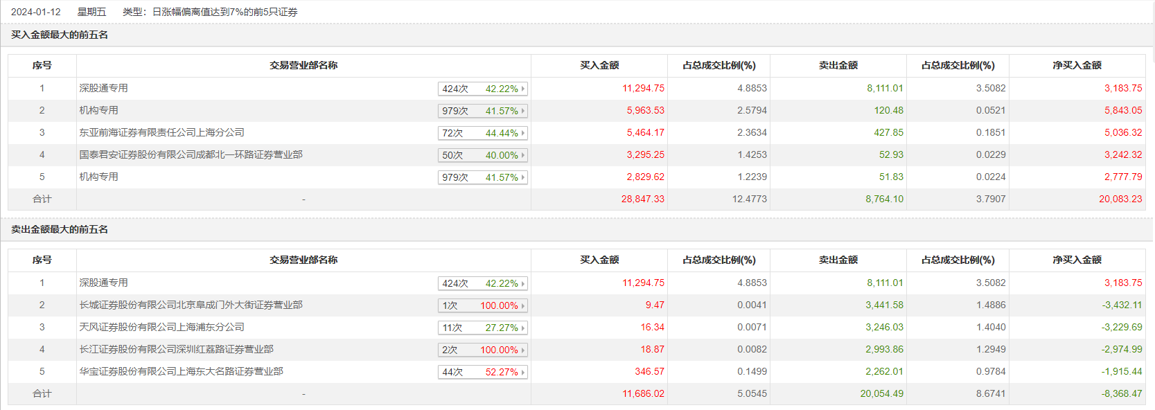 1月12日,智度股份今日涨停,全天换手率达21.33%,振幅达6.35%。龙虎榜数据显示,营业部席位合计净买入8531.01万元。其中,机构买入8793.15万元,卖出172.31万元,合计净买入8620.84万元。此外,深股通专用、东亚前海证券上海分公司分别买入1.13亿元、5464.17万元;深股通专用、长城证券北京阜成门外大街证券营业部分别卖出8111.01万元、3441.58万元。