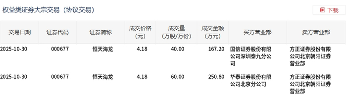 10月30日,恒天海龙大宗交易成交100万股,成交额418万元,占当日总成交额的5.27%,成交价4.18元,较市场收盘价4.54元折价7.93%。