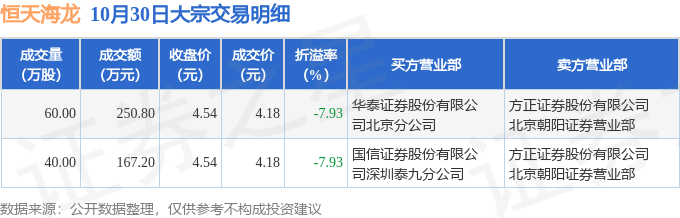 证券之星消息,10月30日恒天海龙发生大宗交易,交易数据如下: