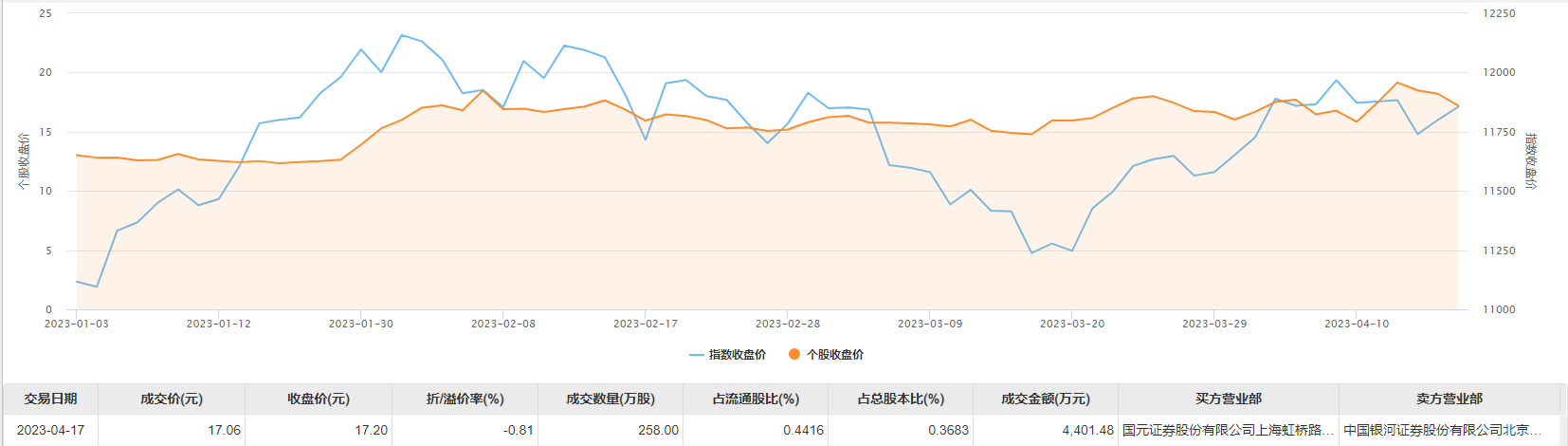 4月17日大宗交易成交258万股,成交额4401.48万元,占当日总成交额的3.87%,成交价17.06元,较市场收盘价17.2元折价0.81%。