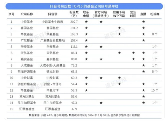 据道乐研究院不完全统计,截至2024年3月19日,已有91家基金公司运营120个抖音账号,部分基金公司还开设和运营子账号、子品牌,其中前海开源基金、易米基金开设抖音账号超4个。