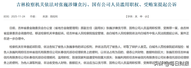 白城市人民检察院起诉指控:张巍利用担任吉林信托长春信托部总经理期间,利用职务便利侵吞公共财物,数额特别巨大;滥用职权,致使国家利益遭受特别重大损失;为他人谋取利益,非法收受他人财物,数额巨大。值得关注的是,张魏于2023年10月调任吉林省委金融委员会办公室(省地方金融管理局)副主任(副局长),2025年3月因涉嫌严重违法违纪被吉林省纪委监委纪律审查和监察调查,并于11月被中纪委通报“双开”。
