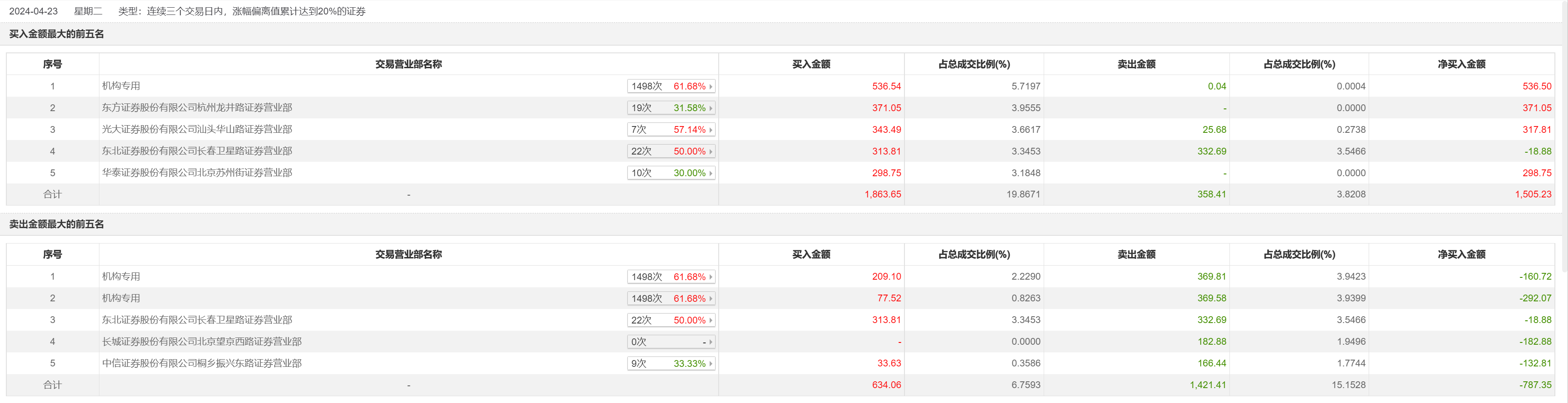 具体来看,机构买入823.15万元,卖出739.43万元,合计净买入83.72万元。此外,章盟主(东方证券杭州龙井路证券营业部)、光大证券汕头华山路证券营业部分别买入371.05万元、343.49万元;东北证券长春卫星路证券营业部、长城证券北京望京西路证券营业部分别卖出332.69万元、182.88万元。