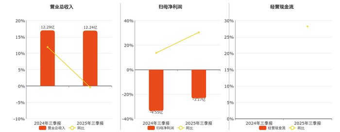 公司营业总收入为12.24亿元。归母净利润为-3.17亿元,较去年同报告期归母净利润增加1.38亿元,实现3年连续上涨。经营活动现金净流入为-4.84亿元,较去年同报告期经营活动现金净流入增加1.90亿元。