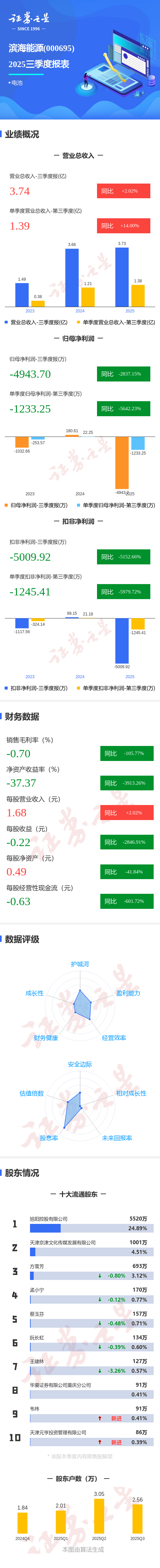 证券之星消息,滨海能源2025年三季报显示,公司主营收入3.74亿元,同比上升2.03%;归母净利润-4943.7万元,同比下降2837.15%;扣非净利润-5009.92万元,同比下降5152.66%;其中2025年第三季度,公司单季度主营收入1.39亿元,同比上升14.0%;单季度归母净利润-1233.25万元,同比下降5642.23%;单季度扣非净利润-1245.41万元,同比下降5979.73%;负债率90.45%,投资收益-18.79万元,财务费用1678.11万元,毛利率-0.7%。