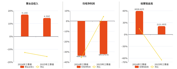公司营业总收入为4.32亿元。归母净利润为-8472.47万元,较去年同报告期归母净利润增加390.63万元。经营活动现金净流入为2121.95万元。