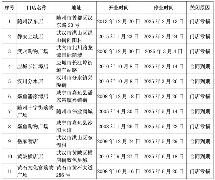 图源:中百集团公告DoNews注意到,年内中百集团30家被关闭的仓储大卖场中,23家是由于“门店亏损”,7家由于“合同到期”。其中,不乏营业时间长达20年左右的老店,比如2005年4月30日开业的随州十字街购物广场、2005年12月30日开业的武穴购物广场、2006年12月28日开业的孝感城站路购物广场等,另有武汉K11购物艺术中心店、宜昌方圆荟店等开业仅3年的门店,其它的一些门店开业时间也基本有十多年,可见这次中百集团关店力度之大。