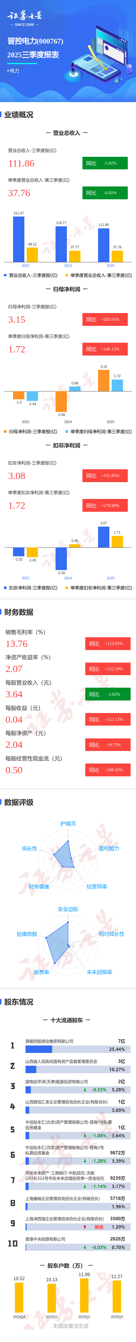 图解晋控电力三季报:第三季度单季净利润同比增长146.12%