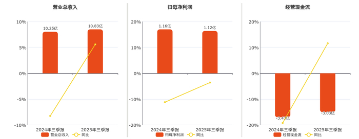 公司营业总收入为10.83亿元,在已披露的同业公司中排名第49,较去年同报告期营业总收入增加5742.45万元,同比较去年同期上涨5.60%。归母净利润为1.12亿元,在已披露的同业公司中排名第43,较去年同报告期归母净利润减少414.10万元,同比较去年同期下降3.58%。经营活动现金净流入为-3.03亿元,在已披露的同业公司中排名第150,较去年同报告期经营活动现金净流入增加3982.54万元。