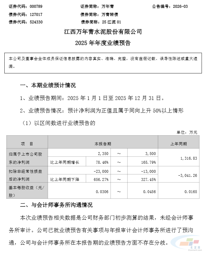1月31日,万年青(000789)发布全年业绩预告,公司预计2025年1-12月业绩大幅上升,归属于上市公司股东的净利润为2350.00万至3500.00万,净利润同比增长78.46%至165.79%,预计基本每股收益为0.0306至0.0456元。