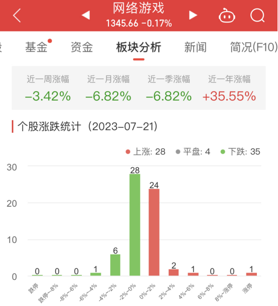 中国经济网北京7月21日讯今日,网络游戏板块整体跌幅0.17%,其中28只股票上涨,4只股票平盘,35只股票下跌。